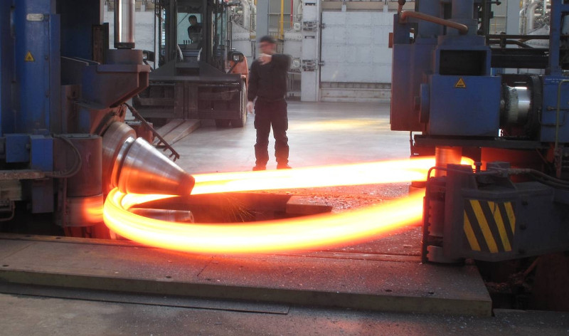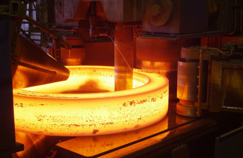 Ring rolling is an important industrial metal forming process. It is used to make parts for a variety of purposes, from oil platform legs to aircraft engine parts. A ring rolling mill is shown above. The two vertical rolls in the centre of the image squeze the ring, thinning it. Two horizontal conical rolls (one of which can be seen on the left) prevent the ring from increasing in height, and so as it thins it must expand in diameter. A further two vertical support rolls help keep the ring centered. The ring is rolled warm, and is returned to the furnace for reheating several times during the rolling process. A video of this process is given below.