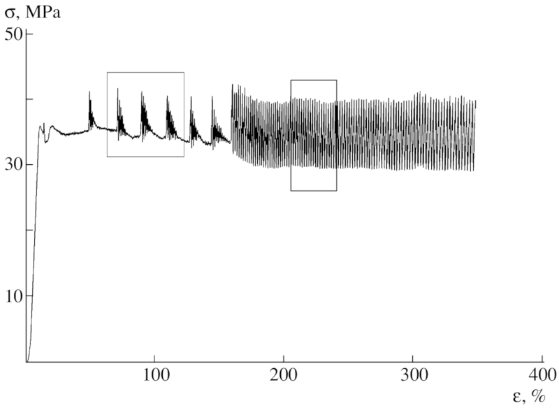 Figure 4. Stress–strain plot of uniaxial extension of PET plastic, showing two different types of instabilities. From figure 2a of Bazhenov & Kechekyan (2002).